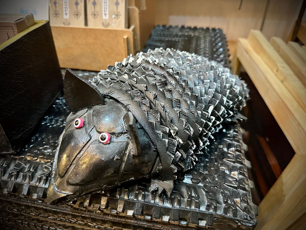A műhellyel szemben álló boltba átsétálva Abdel egy táskát tesz elém. A gumi egykor egy traktoron szolgált, a vállpánt pedig egy kiszuperált taxi biztonsági övéből készült. A sün alakú darab lábtörlő, a csigák ajtótámaszok – mindegyik tárgy megőrzi előző életének nyomait, miközben teljesen új funkciót kap.