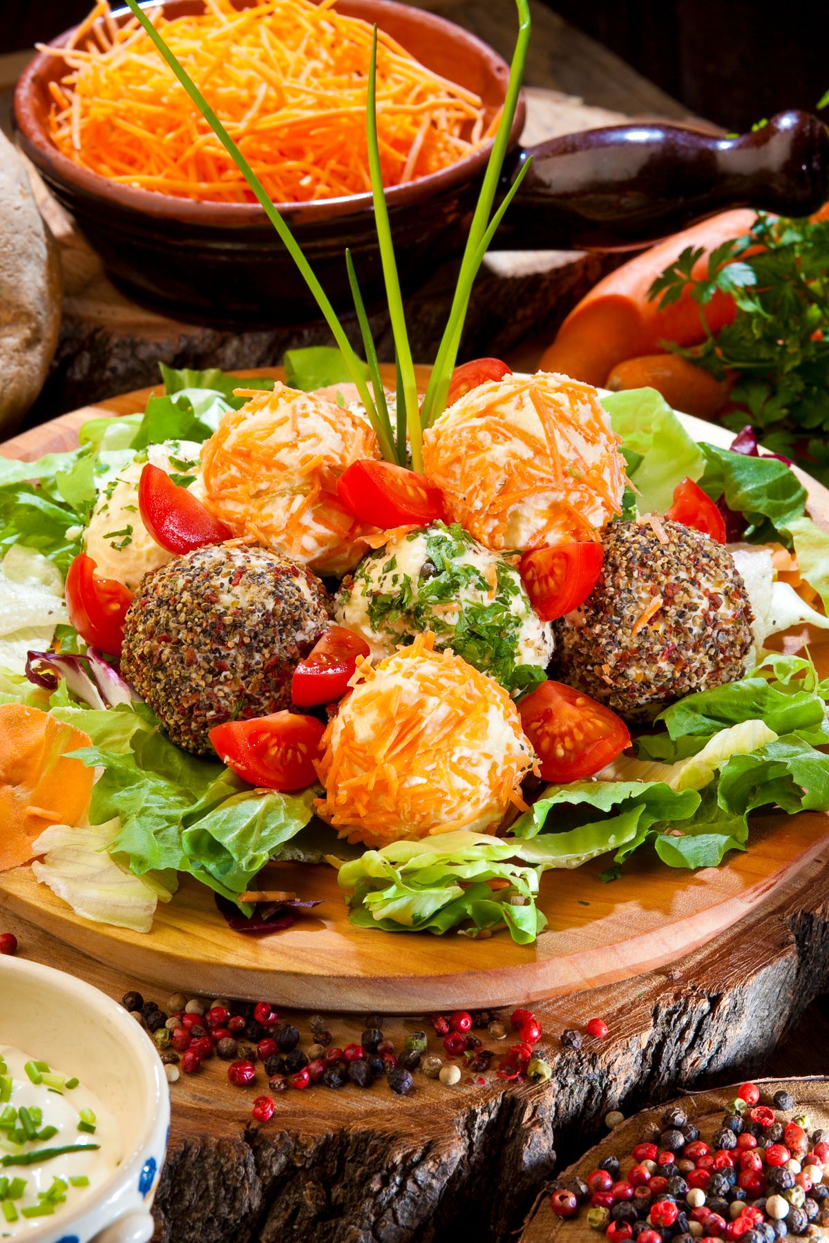 A vajat felpuhítjuk, hozzáadjuk a sajtkrémet, és összedolgozzuk a megreszelt trappistával meg a juhsajttal (vagy az áttört juhtúróval). Sóval ízesítjük – más fűszert nem is ajánlunk hozzá, mert elviszi a sajtok ízét. A sajtmasszából kis gömböket formázunk, és megforgatjuk színes durva borsban, aprított petrezselyemben, reszelt sárgarépában.