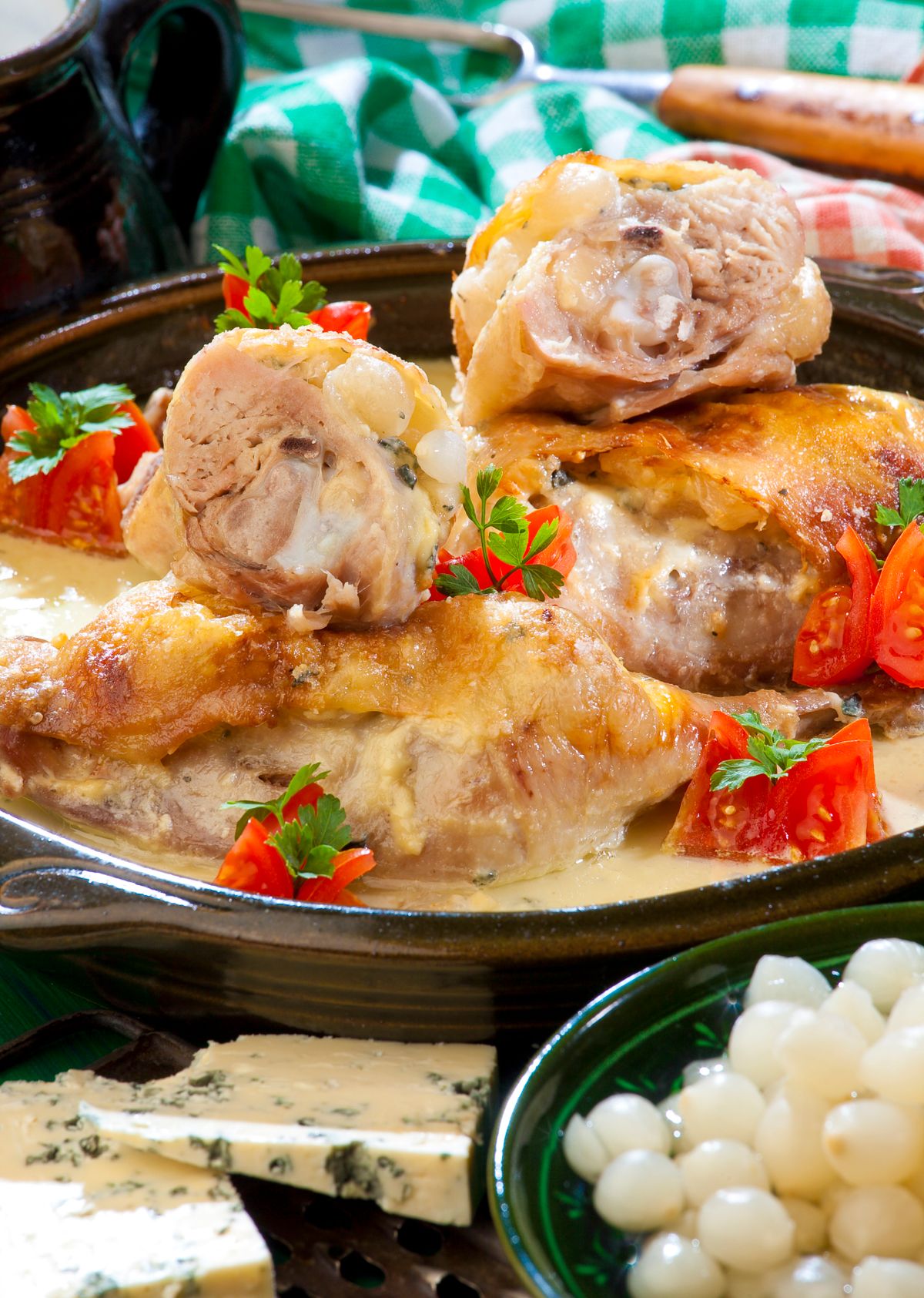 Gyöngyhagymás csirkecomb kéksajttal sütve