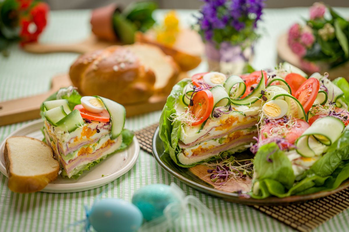 A puha vajat kikeverjük a reszelt sajttal, ízlés szerint sóval, borssal. A mascarponét pedig az apróra vágott petrezselyem zöldjével forgatjuk össze, szintén sóval, borssal fűszerezzük. A főtt tojást felkarikázzuk. Levelekre bontjuk a salátát. Egy 22 cm átmérőjű kerek tortaformát kibélelünk több réteg levéllel úgy, hogy az oldalára is jusson. Egy réteg reszelt sajtos krémet kanalazunk rá, erre jön pár szelet sonka, sajt, szalámi, tojás. A tetejére a mascarponés krémből kenünk egy réteget. Most következhet egy réteg salátalevél, majd ezt még egyszer megismételjük. A tetejére már nem kell saláta. Hideg helyen dermesztjük pár órát. Tálalás előtt vékony uborkacsíkokkal, paradicsomkarikákkal, főtt tojással, csírákkal díszítjük a tetejét. Remekül illik mellé egy nagy szelet húsvéti kalács.
