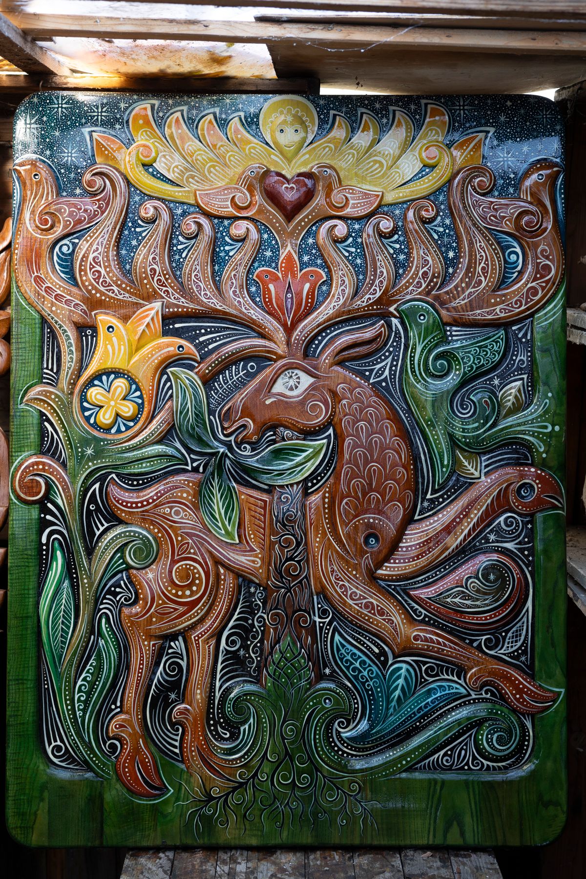 A hajdúsági pusztában álló magányos tanya tornácára kedvesen beköszön a Nap, és sugaraival szinte simogatja a zöld-sárga-piros színekben megfestett kaputükröt. Korábban a temetőbejáratnál lévő lélekliget faragott fakapunak a díszes részét újította fel, lehelt bele ismét életet. Nem szürke ridegséget áraszt, hanem mintájában, árnyalataiban természetes melegség lakozik; elfogadás, belenyugvás a földi érkezés-távozás állandóságába. A kép lényegében a Fehérlófia történetének képi kivetülése: két griffmadár őrzi az életmagot, közepén a szkíta szarvas agancsa szerteágazik, szimbolizálva az élet örök, végtelen körforgását.