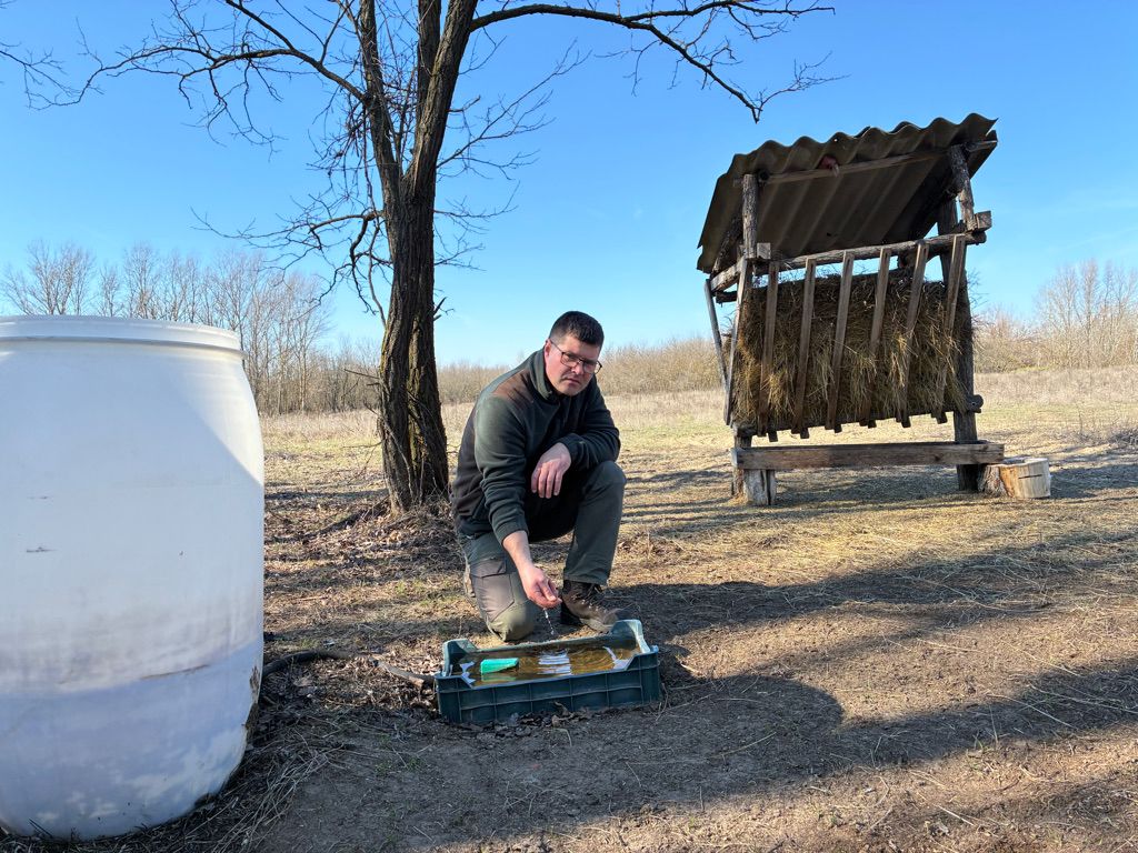 – Birtokomon két éve gondoskodom a vadakról, etetem-itatom őket. Erre eleinte csak nyáron, most már télen is szükség van – meséli a természet szerelmese. – Ezt a szálas- és szemestakarmány-etetőt a vadászokkal telepítettem ide, a közeli magaslest pedig magam készítettem, szigorúan vadak megfigyelésére. Időnként saját pénzemen veszek szénát, takarmányt, de eddig számíthattam a majsai vadásztársaság adományaira is, sőt legutóbb a helyi általános iskolások gyűjtöttek vadeleséget erre a célra. Mintegy 30 hektáron négy víztartályt és fóliás itatót helyeztem ki, nyáron kéthetente 1800 liter vizet szállítok a terepre.