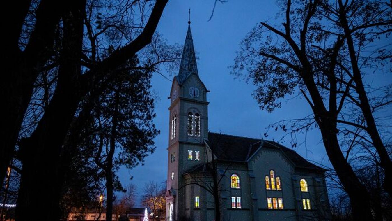 Az Orosháza-Szentetornyai evangélikus templomot adventben fényfüzérekkel díszítenek fel.